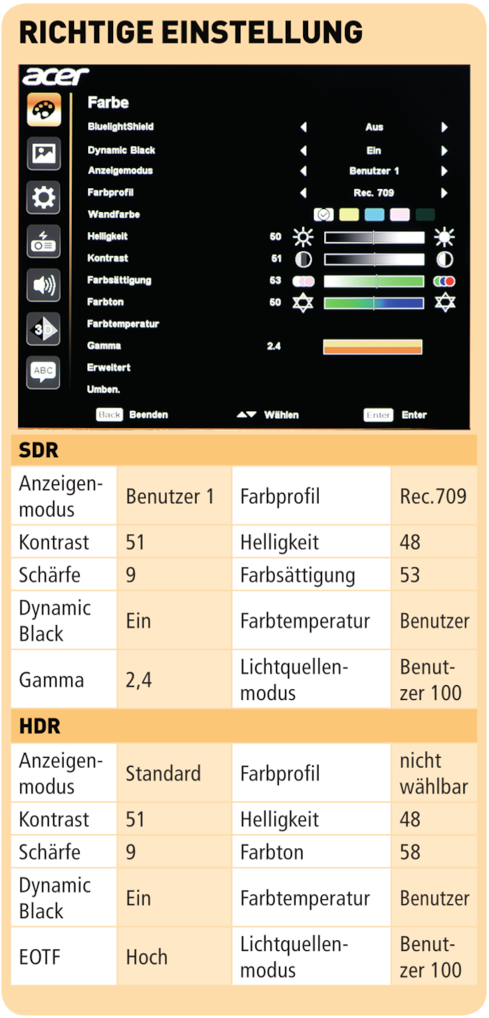 Ein Sechs-Achsen-Farbmanagement, RGB-Gain/Offset-Regler und ein rudimentäres Gamma-Menü bieten die Möglichkeit, die ab Werk gute Farbdarstellung zu optimieren. Für SDR, HDR und 3D können separate Einstellungen im User-Preset abgelegt werden, auf die der Projektor selbstständig zugreift, sobald ein entsprechendes Bildsignal anliegt. Gamer profitieren von einem hellen „Spiele“-Modus, der mit einem Input Lag von 6,6 Millisekunden bei 240Hz@1080p-Zuspielung aufwartet.