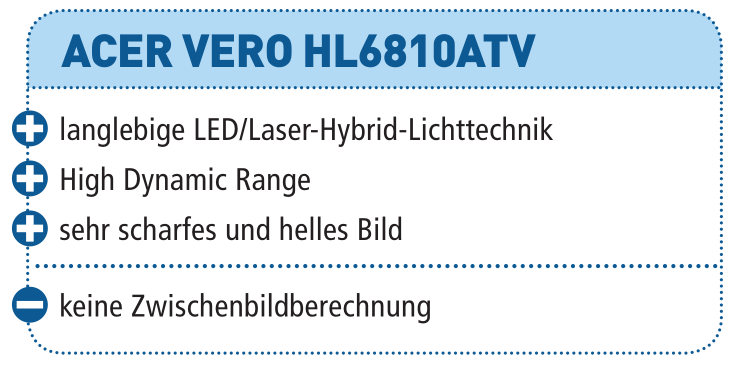 Im Acer HL6810ATV arbeitet der neue 0,65-Zoll-Chip von Texas Instruments mit 1080p-Auflösung. Via XPR-Shift können Bildsignale bis zu 3.840 x 2.160 Pixel sequenziell projiziert werden (siehe Kasten). Als Lichtquelle kommt eine LED-Laser- Hybrid-Technologie zum Einsatz. Hierbei handelt es sich um blaue Laserdioden, die zusätzlich mit einem Phosphor-Element Grün emittieren. Rote LEDs komplettieren die RGB-Wiedergabe.