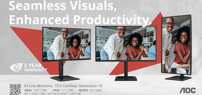 AOC präsentiert mit seiner neuen Essential E4-Reihe eine umfassende B2B-Serie von 24“ Monitoren bis hin zu 34“ Ultrawide-Displays mit Auflösungen von Full HD bis 4K UHD. Das Besondere daran: Alle Modelle tragen das Siegel TCO Certified, generation 10 – eine globale Nachhaltigkeitszertifizierung für IT-Produkte, die Umwelt-, Sozial- und Kreislaufwirtschaftskriterien abdeckt – und bieten eine fünfjährige Garantie.