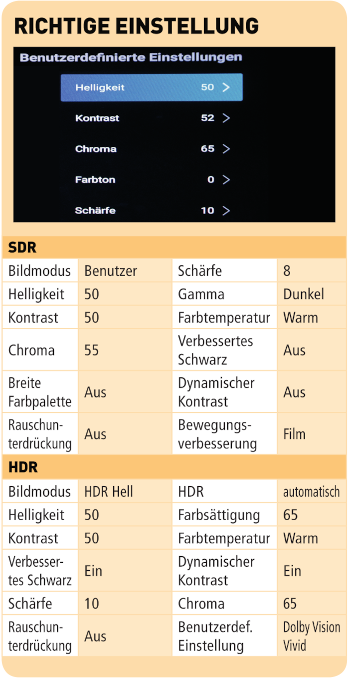 Vom Hersteller liegen uns mit 1.700 und 2.000 Lumen unterschiedliche Helligkeitsangaben vor. Also haben wir selbst nachgemessen. Unser Proband erzielt exakt 2.066 Lumen im Bildmodus „Hell“ mit einer zu kühlen Farbtemperatur von 10.650 Kelvin. Wir schalten daher in den „Benutzer“-Modus zur Kalibrierung. Heraus kommen bei einer Farbtemperatur von 6.500 Kelvin 1.730 Lumen (SDR) und 1.915 Lumen (HDR). Das reicht aus, um Leinwandbreiten bis 4,20 Meter mit HDTV- und 3,15 Meter mit HDR-Signalen zu befeuern, oder entsprechend kleinere Bildwände bei zunehmendem Umgebungslicht beispielsweise im Wohnzimmer.