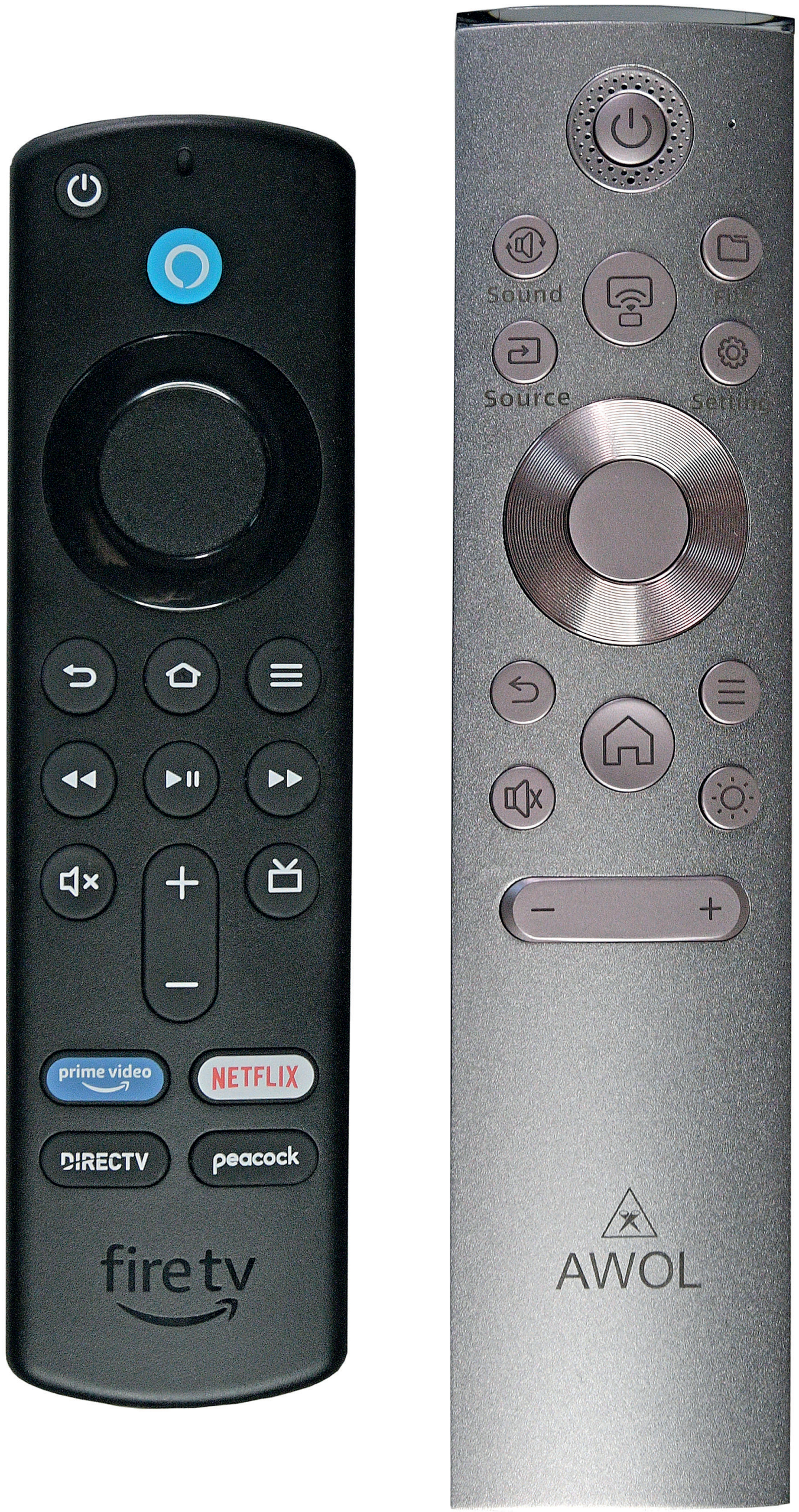 Zwei Fernbedienungen sind im Lieferumfang enthalten. Während mit dem großen Controller (rechts) alle Einstellungen am Beamer durchgeführt werden, ist die kleinere Fire-TV-Remote für die Smartfunktionen vorgesehen. Für Netflix und Prime Video gibt es Direktwahltasten.