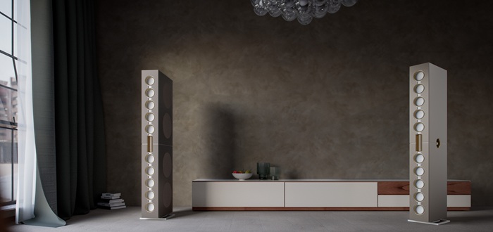 Eine spezielle Rahmenfußkonstruktion aus Stahl sorgt für den optischen Eindruck einer schwebenden Skulptur, die trotz ihrer 1,7 m Höhe nicht den Raum dominiert. Eine besonders hochwertige Lackierung, abgesetzte Einfassungen der Treiber sowie eine scheinbar schwebende Montage der Schallwand und Seitenwände sorgen für zusätzliche Leichtigkeit im Auftritt.