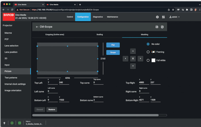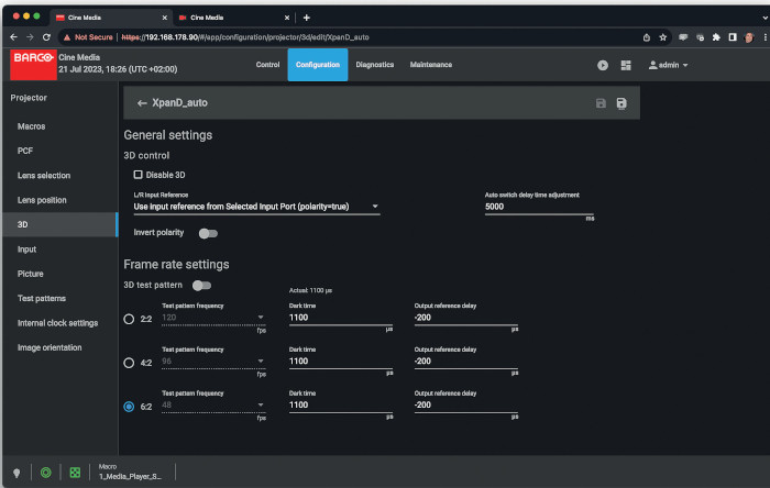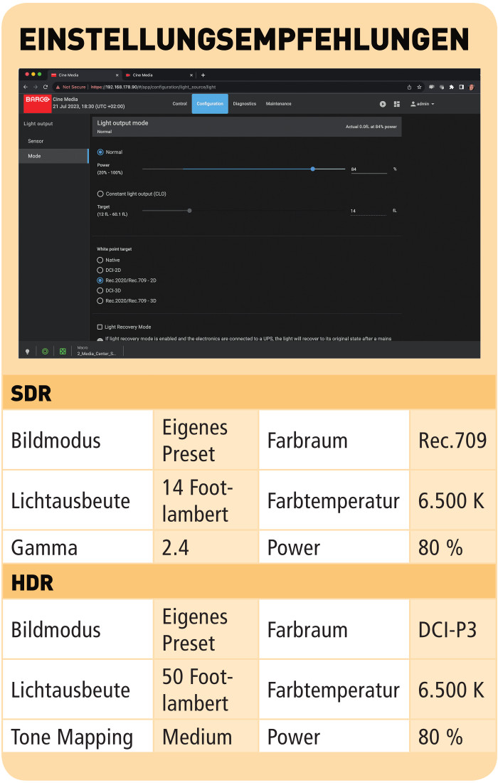 Einmal konfiguriert, macht es der Barco Freya dem Nutzer denkbar einfach. Wir legen einen Film in den Blu-ray-Player und starten ihn. Der Projektor erkennt selbstständig, ob es sich um 3D, 2D-SDR oder 2D-HDR handelt, und nutzt das entsprechende Preset. Der Wechsel erfolgt via Lens-Memory auf die verschiedenen Bildformate wie zum Beispiel 16:9, 1,85:1, 2,00:1, 2,20:1 und 2,39:1. Darüber hinaus wird die Lichtausbeute auf 14 Footlambert für HDTV-Inhalte und SDR programmiert, weil dies dem Standard für DCI-Kinofilme entspricht. HDR-Inhalte werden mit 50 Footlambert in der Spitze wiedergegeben. Für 3D wird die gesamte zur Verfügung stehende Lichtleistung aktiviert, damit hinter der 3D-Brille die höchste Helligkeit erzielt wird.