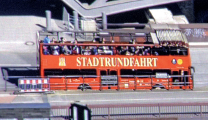 Die Ausschnittsvergrößerung aus unserem Hamburg-Panorama legt offen, wie exakt der Projektor feinste Details darstellt. Brückengeländer und Personen im Bus haben wir noch nie so deutlich gesehen.