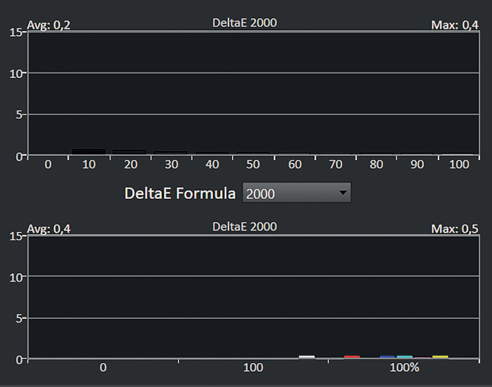 Die Delta-E-Werte sind herausragend: Der Graustufenverlauf besitzt eine durchschnittliche Abweichung von 0,2 Prozent (oben) sowie bei Primär/Sekundärfarben und Weißpunkt 0,4 Prozent (unten).