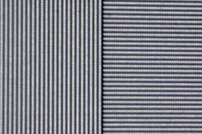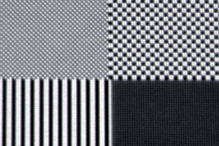 Unsere Makroaufnahme belegt, dass sogar einzelne schwarze und weiße Pixel in UHD-Größe dargestellt werden (oben links). Ein Full-HD-Pixel besteht aus vier einzelnen UHD-Pixeln, was oben rechts gut ersichtlich ist.