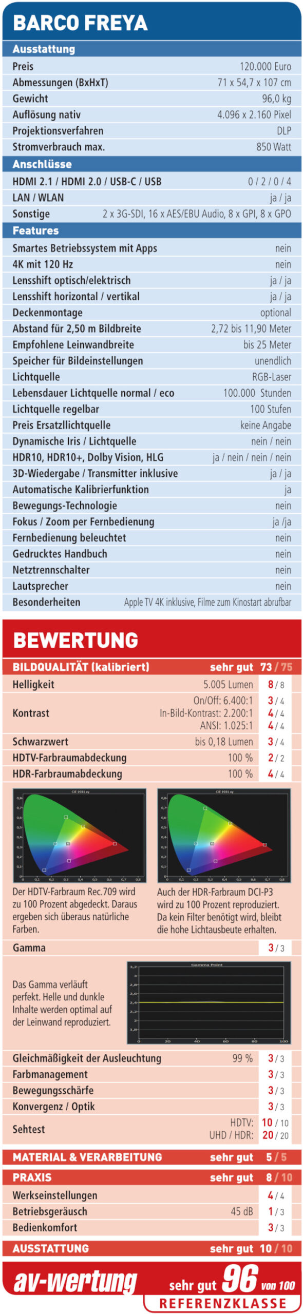Als Lichtquelle kommen RGB-Laserdioden zum Einsatz, die ein größeres Farbspektrum abdecken können, als es mit blauen Laser/Phosphor-Technologien der Fall ist. So wird für den Freya der Rec.2020-Farbraum mit einer Abdeckung von 99 Prozent beziffert (siehe Kasten nächste Doppelseite). Die Lebensdauer wird von Barco mit 40.000 Stunden spezifiziert – bei 80 Prozent Lichtleistung. Das bedeutet: Der Projektor verliert innerhalb von 40.000 Betriebsstunden lediglich 20 Prozent seiner Maximalhelligkeit. Umgerechnet auf die Lebensdauer von Consumer-Projektoren, die sich auf 50 Prozent Lichtleistungseinbußen bezieht, entspricht das beim Freya einer Lebensdauer von 100.000 Stunden! Erst dann hat sich seine Maximalhelligkeit halbiert.