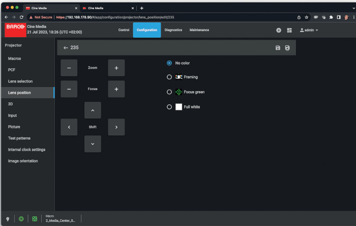 Ein klassisches Farbmanagement, wie wir es aus den meisten Heimkino-Projektoren kennen, besitzt der Freya nicht. So sind keine Schieberegler für Kontrast, Helligkeit und Farbe vorhanden. Stattdessen ist nur eine Kalibrierung vonnöten. Es werden der Weißpunkt sowie die Primärfarben Rot, Grün und Blau angepasst. Dieses 6-Achsen-Farbmanagement bezeichnet Barco als P7 (7-Achsen Color Management System). Alle Spektren für HDTV und HDR sollen dann passen. Darauf gehen wir in diesem Test noch näher ein.