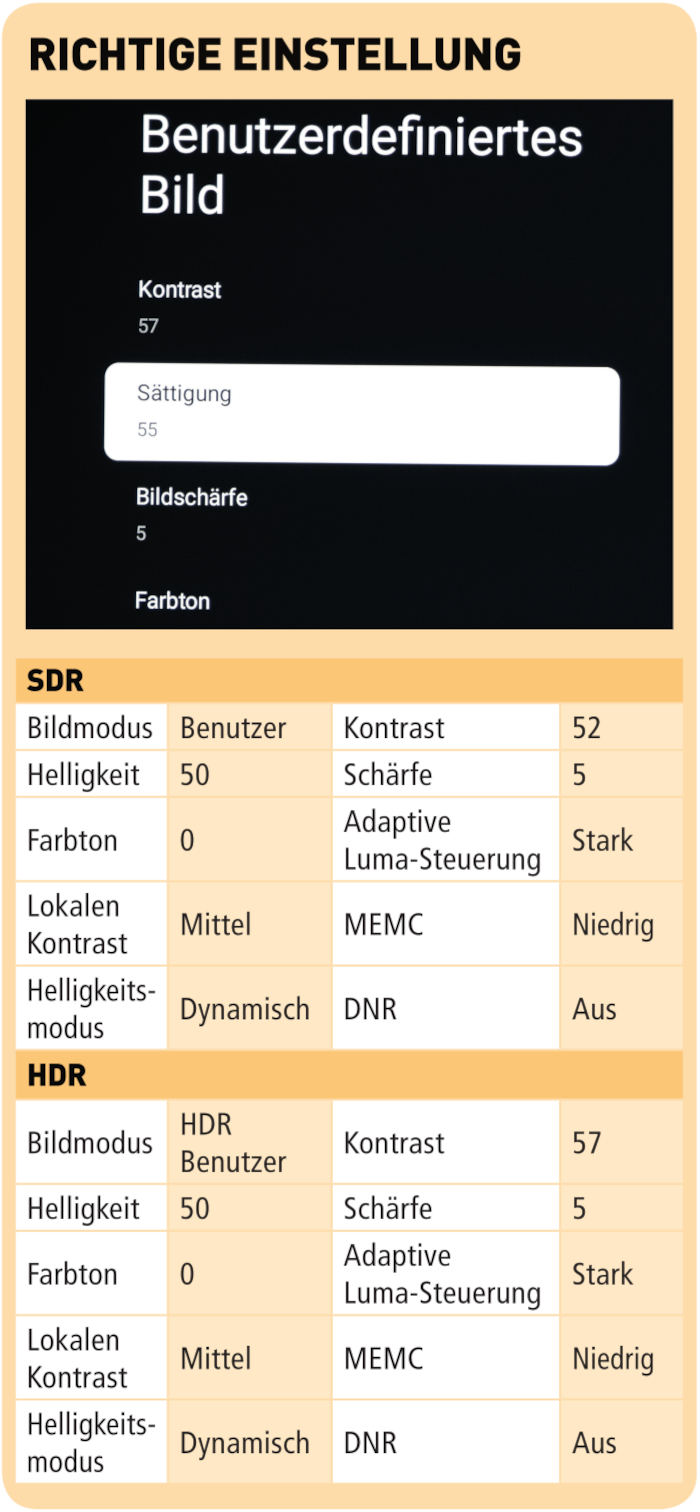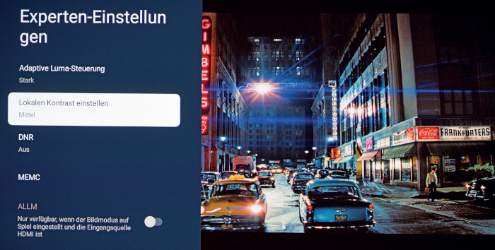 Wird die „Adaptive Luma-Steuerung“ von „Aus“ auf „Stark“ gestellt, nimmt die Leuchtkraft der Bilder schlagartig zu. Dunkle Bereiche werden besser durchgezeichnet und der Grauschleier verschwindet aus Nachtaufnahmen. Der Reiter „Lokalen Kontrast einstellen“ sorgt auf „Mittel“ für noch mehr Plastizität. Letztendlich sollte der „Kontrast“-Regler von 50 auf 57 angehoben werden. Denn mit diesem Wert wird die Maximalhelligkeit beim 1.000-Nits-Signal ausgeschöpft. Gegenüber der etwas dunkleren Werkseinstellung ergeben sich mit dieser Kombination sattere Farben, eine höhere Lichtausbeute mit exzellenter Schattenzeichnung und eine gesteigerte Plastizität.