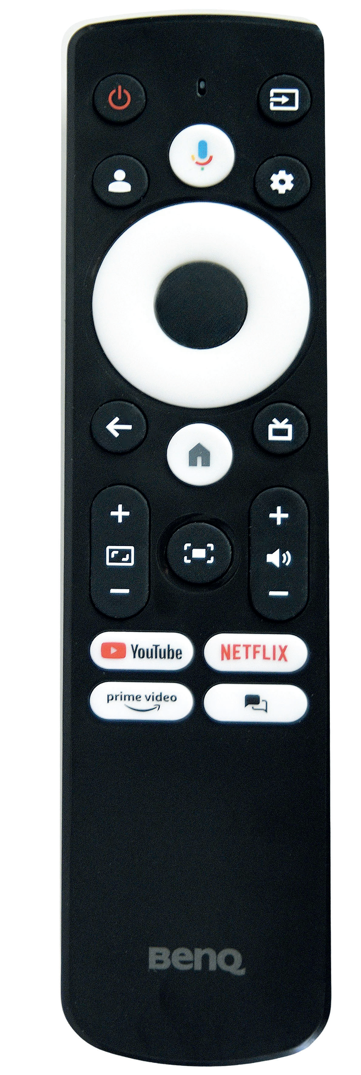 Zum BenQ GP520 gehört eine handliche Fernbedienung, deren Tastatur nicht hinterleuchtet ist, so dass die Navigation in dunkler Umgebung schwerfällt. Direktwahltasten für Autofokus, Auto-Geometrie, Sprachsteuerung, Eingangswechsel, Menüeinstellungen und Lautstärke sind ebenso vorhanden wie für YouTube, Netflix und Prime Video.