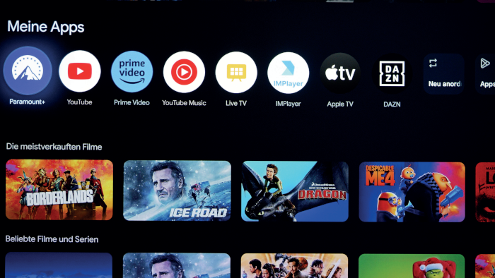 Google TV bietet die bewährte Kacheloptik mit Empfehlungen. In „Meine Apps“ können weitere Streamingdienste hinzugefügt und in der Leiste verschoben werden.