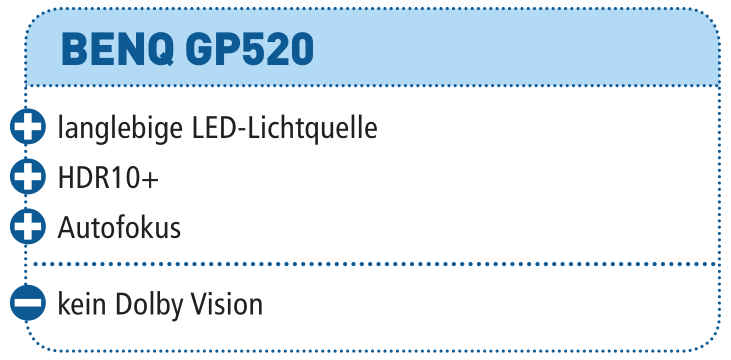 Der BenQ GP520 ist ein Ein-Chip-DLP-Projektor mit 0,47-Zoll-DMD und nativer Full-HD-Auflösung. Mittels XPR-Shift-Technologie können bis zu 3.840 x 2.160 Pixel verarbeitet und sequenziell projiziert werden. Als Lichtquelle wird auf die bewährte 4LED-Technik gesetzt, die mit einer Lebensdauer von 20.000 Stunden bei maximaler Lichtleistung und 30.000 Stunden im Eco-Modus beziffert ist. In Sachen HDR werden die Formate HDR10+ und HLG unterstützt. In Verbindung mit der „Adaptiven Luma-Steuerung“ und dem „Lokalen Kontrast“ können Lichtintensität und Durchzeichnung weiter gesteigert werden (siehe Kasten).