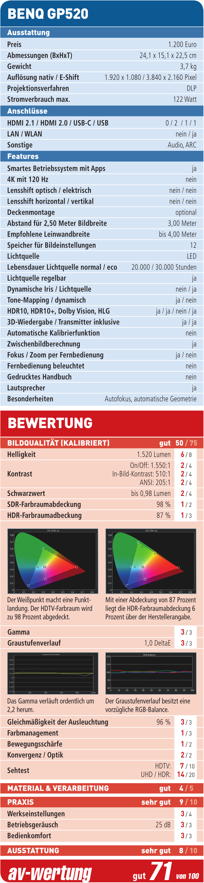Der Testbericht BenQ GP520 (Gesamtwertung: 71, Preis/UVP: 1.200 Euro) ist in audiovision Ausgabe 1-2025 erschienen.