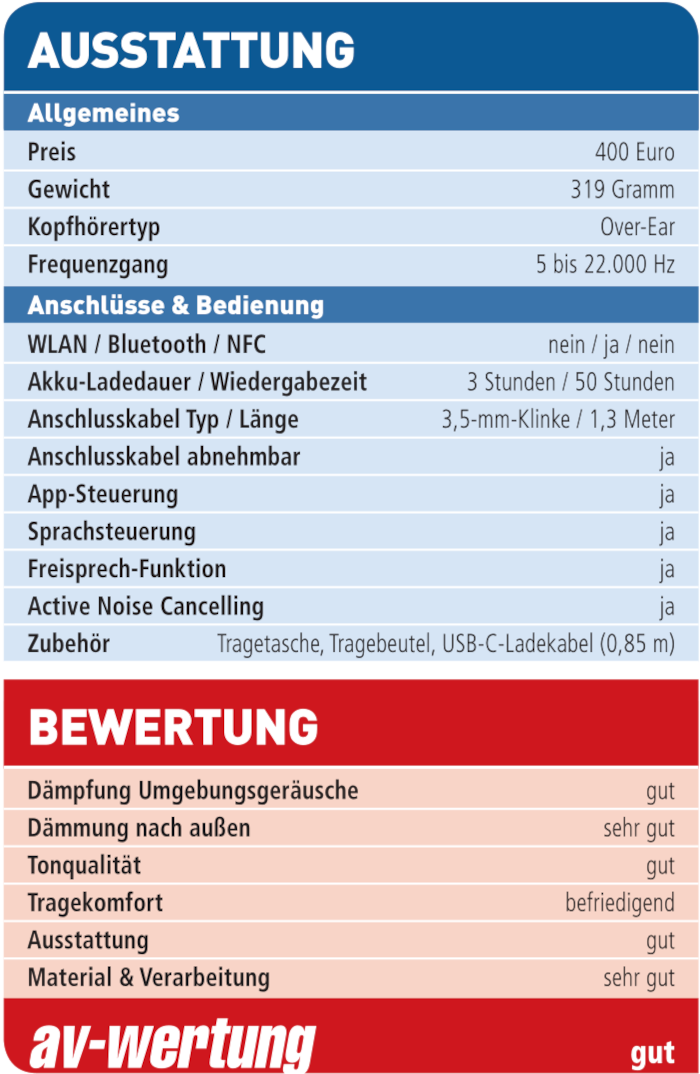 Mit 50 Stunden Spielzeit äußerst ausdauernder Allrounder mit guten Leistungen bei Klang, Noise Cancelling und Ausstattung – Equalizer und Tragekomfort sind aber nur Mittelmaß.