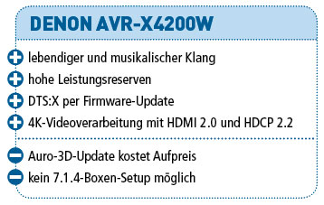 Denons AVR-X4200 verzückt mit musikalischem Klang und viel Leistung. Dank HDCP 2.2 blickt er sicher in die UHD-Zukunft. Mit Atmos, Auro und DTS:X sind zudem alle 3D-Tonformate an Bord.
