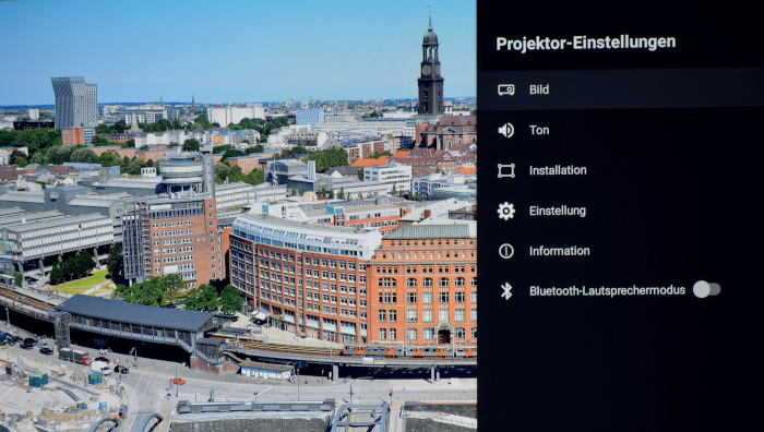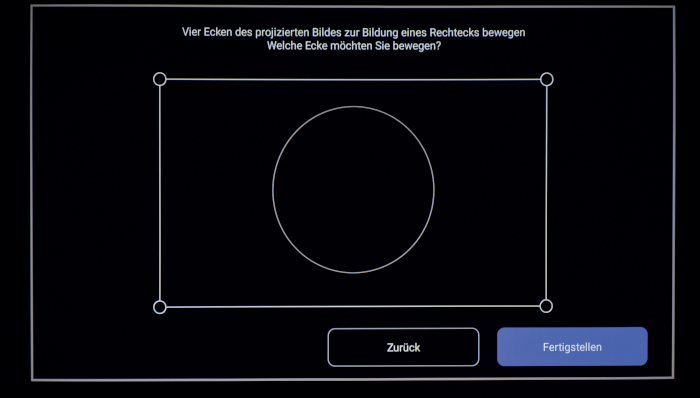Das Installations-Menü nimmt den Nutzer direkt an die Hand und führt diesen durch das Einstellprozedere. Sprachauswahl und Netzwerkeinstellung gelingen im Handumdrehen. Die Verbindung mit unserem Google-Konto funktioniert via Smartphone oder On-Screen-Tastatur. Die Bildanpassung erfolgt mit Epsons Setting Assistant App, die das Bild mit einem Klick automatisch ausrichtet. Dafür wird ein Smartphone benötigt. Alternativ kann das Bild manuell ausgerichtet werden. Dank 4-Ecken-Anpassung wird eine Leinwand geometrisch perfekt ausgeleuchtet, auch wenn Sideboard oder Bildwand nicht ganz in Waage sein sollten. Die hinteren Standfüße können zur Nivellierung separat herausgedreht werden.