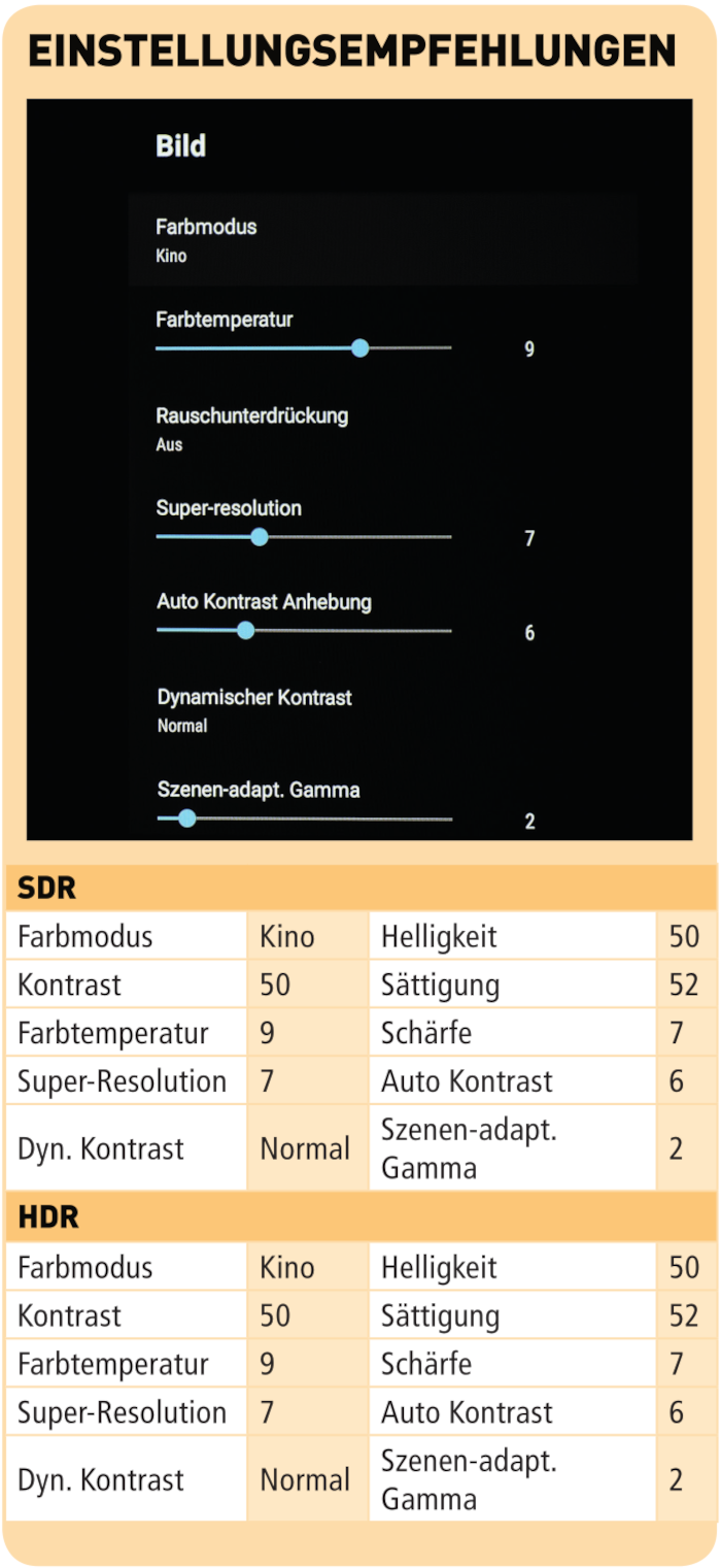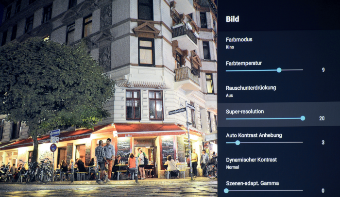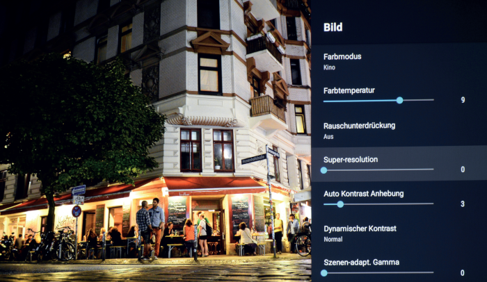 Der Fokus ist über die gesamte Bildfläche ordentlich. Von üblichen Sitzabständen sind keine Defizite auszumachen, so dass das Menü durchweg scharf abgebildet wird, ebenso wie Texte und Laufschriften vom Live-Ticker diverser TV-Sendungen.
