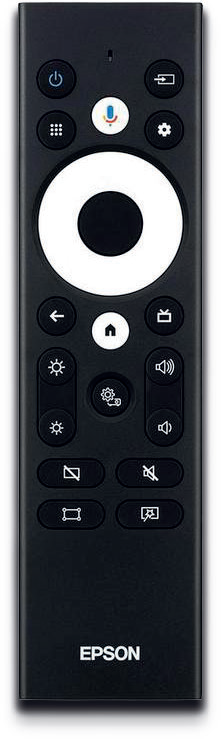Die Tastatur auf der Fernbedienung ist nicht hinterleuchtet. Sie bietet Direktwahltasten für Sprachsteuerung, Mainmenü, Bildeinstellungen, Lautsprecher-Pegeleinstellung und Helligkeitsregelung für die Laserdioden.