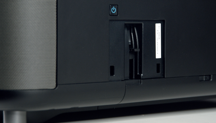 Das Design ist nicht nur optisch gefällig, sondern punktet mit durchdachter Bedienmöglichkeit und einem Anschlussfeld, das komplett auf der Rückseite des Gehäuses eingelassen ist. Praktisch ist der Fokus-Regler, der sich hinter einer Klappe auf der rechten Seite befindet, um die Schärfe für unterschiedliche Bildgrößen exakt einzustellen. Erfreulich finden wir, dass die maximale Leistungsaufnahme mit 163 Watt im Betrieb überraschend deutlich unter der Herstellerangabe von 264 Watt (Peak) liegt. Vergleichbar helle Lampenprojektoren haben wir schon mit viermal so viel Stromverbrauch gemessen. Einen klassischen Ausschalter gibt es nicht, um den Projektor komplett vom Stromnetz zu trennen – was in Anbetracht eines Stromverbrauchs von 0,2 Watt im Standby aber nicht weiter tragisch ist.
