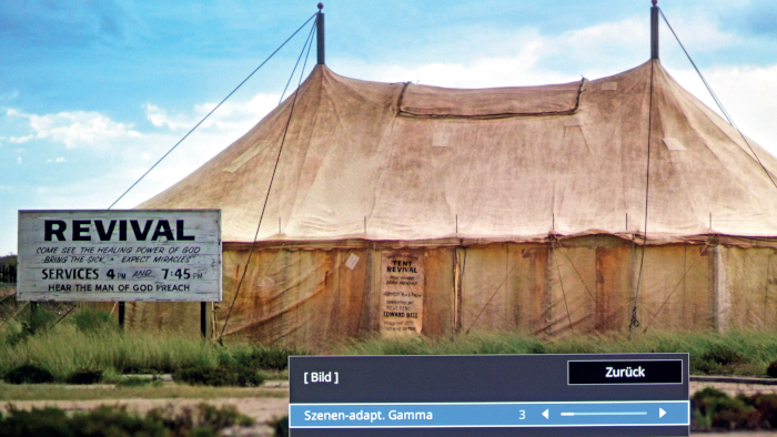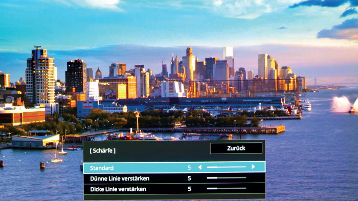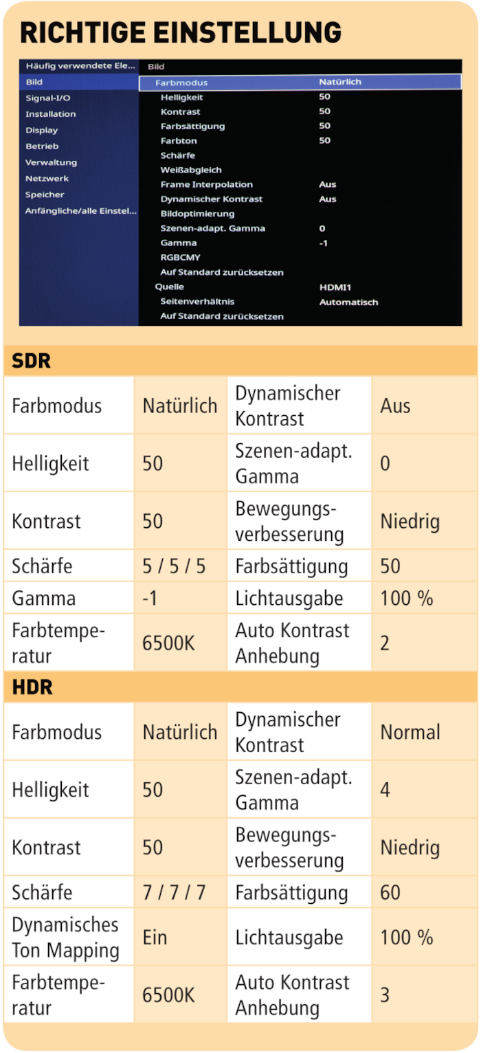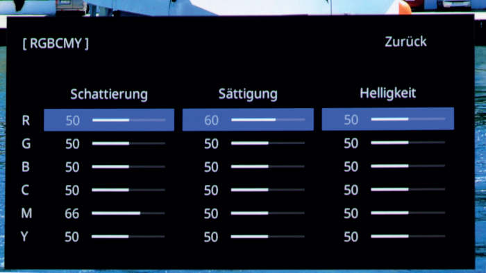 Sollte die Konvergenz nicht passen, können die Säume leicht behoben werden, indem diese entsprechend verschoben werden. Unser Proband bietet dafür zwei Möglichkeiten: Die Anpassung erfolgt in allen vier Ecken, oder es wird das ganze Fernster versetzt. Die Farbeinstellungen finden wir hingegen suboptimal. Wird zum Beispiel der Bildmodus „Natürlich“ für SDR-Inhalte verwendet, können wir darin alle gewünschten Anpassungen vornehmen. Wird danach ein HDR-Signal übertragen, wechselt „Natürlich“ nicht etwa in einen eigenen „HDR“-Modus. Vielmehr führen Einstellungen nun dazu, dass die für SDR vorgenommenen Parameter überschrieben werden. Das lässt sich nur vermeiden, indem man die Anpassungen in separate Speicher ablegt.