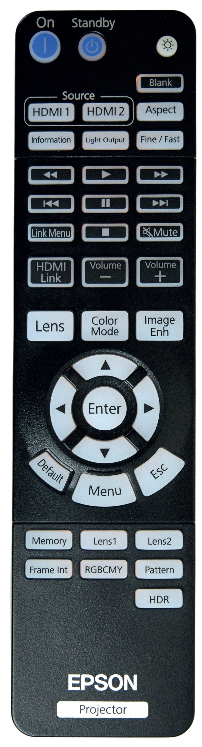 Die relativ große Fernbedienung besitzt eine illuminierte Tastatur. Praktisch sind die Direktwahltasten für Lens-Memory 1 und 2; hinter dem Lens-Button befinden sich Fokus, Zoom und Lens-Shift.