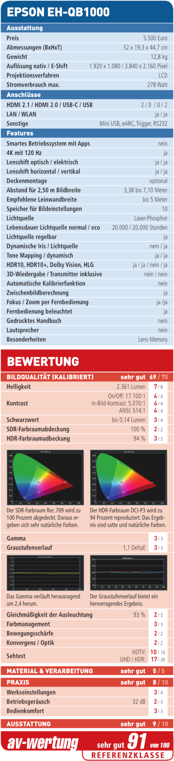 Nach dem erstmaligen Einschalten befindet sich der Epson EH-QB1000 im Bildmodus „Lebendig“. Das Betriebsgeräusch hat hier einen recht angenehmen Pegel von 29 Dezibel. Allerdings geben die Laserdioden nicht 100 Prozent ihrer Leistung ab, sondern liegen rund 11 Prozent darunter. Der Projektor erzielt hier 2.160 Lumen mit einer etwas zu kühlen Farbtemperatur von 8.715 Kelvin. Wir schalten in den Bildmodus „Natürlich“, weil dieser sich in der Vergangenheit herstellerübergreifend für eine präzise Farbabstimmung bewährt hat. Auch in diesem Fall müssen wir nur geringfügige Anpassungen vornehmen, um die Industrievorgaben einzuhalten. Dafür haben wir den Laser auf 100 Prozent gestellt und die Gain/Offsetregler bemüht. Die Lichtausbeute beträgt nun mit korrekten Farben satte 2.361 Lumen für SDR und HDR. Damit lassen sich Bildbreiten bis 5 Meter mit 16 Footlambert (HDTV) befeuern. Für HDR-Signale reicht es immer noch für 3,50 Meter Breite mit 32 Footlambert. Die Maximalhelligkeit ermitteln wir erwartungsgemäß im Bildmodus „Dynamisch“. Die Herstellerangabe von 3.300 Lumen übertrifft unser Testgerät mit 3.390 Lumen, allerdings mit zu kühler Farbdarstellung.