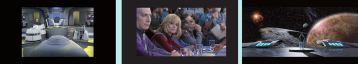 In Anlehnung an die TV-Ausstrahlung wird die „Galaxy Quest“-Episode zu Filmbeginn in 4:3 innerhalb des Cinemascope-Frames gezeigt (linkes Bild). Danach wechselt das Format auf das breitere 1,85:1-Verhältnis (mittleres Bild). Erst mit dem Ausblick auf den echten Weltraum gibt es nach 19 Minuten die volle Cinemascope-Breite (rechtes Bild).