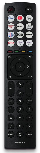 Die Tastatur der Fernbedienung ist übersichtlich konstruiert, aber nicht beleuchtet. Direktwahltasten für beliebte Streaminganbieter sind ebenso vorhanden wie Lautstärkeregler, Kanalwechsler, Sprachsteuerung und ein Zahlenfeld.