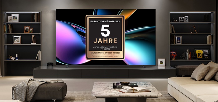 Hisense erweitert ab sofort sein Serviceangebot in Deutschland und der Schweiz: Für ausgewählte Premium-TV-Geräte, wie zum Beispiel den brandneuen NextGen Laser TV L9Q und Modelle der UXQ-Serie, bietet das Unternehmen eine 5-jährige Garantie. Kundinnen und Kunden, die sich innerhalb von zwei Monaten nach dem Kauf auf der Website www.hisense.de/garantieverlaengerung registrieren und ihren Kaufbeleg hochladen, profitieren damit von einer kostenlosen Garantieverlängerung. Die Aktion gilt rückwirkend für Käufe ab September 2025 und läuft bis Dezember 2026.