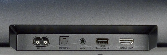 Bei den Anschlüssen merkt man den Einsteiger-Status der HS3100: Die Bar schleift keine AV-Signale durch, da auf HDMI-Eingänge verzichtet wurde. Der HDMI-Out mit ARC empfängt Ton vom Fernseher oder kompatiblen ARC-Geräten. Digitalsound gelangt zudem über Toslink in die Bar, analog via 3,5-mm-Klinke. Der USB-Port dient zur Fütterung eines Media-Players mit Audio-Files (MP3, WMA, FLAC, WAV). Lücken klaffen beim Streaming und der Netzwerkanbindung, denn hier offeriert die Soundbar lediglich Bluetooth. WiFi, LAN, AirPlay, Chromecast, DTS Play-Fi, Multiroom, Apps sowie eine Sprachsteuerung fehlen.