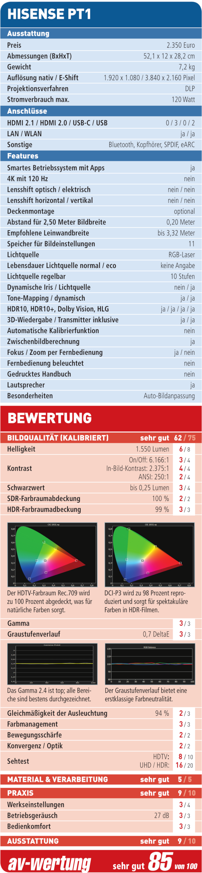 Der Testbericht Hisense PT1 (Gesamtwertung: 85, Preis/UVP: 2.350 Euro) ist in audiovision Ausgabe 11-2025 erschienen.