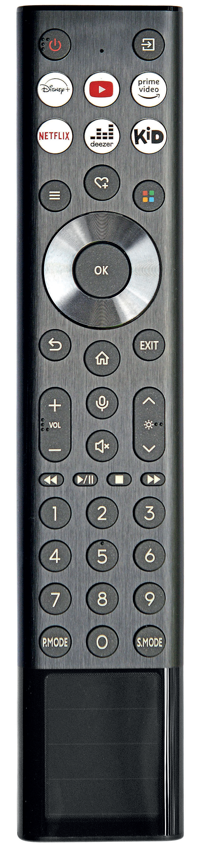 Der Controller bietet zum Aufladen ein Solarpanel und eine USB-Buchse. Sechs Direktwahltasten für Disney+, YouTube, Prime Video, Netflix, Deezer und Kid sind ebenso praktisch wie die Eingangstaste, Lautstärkeregelung und das Mikrofon für die Sprachsteuerung.