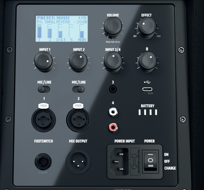 Neben den obligatorischen 3,5mm-Buchsen und einem 6,3mm-Gitarrenstecker sind zwei XLR-Mikrofon-Eingänge verbaut. Außerdem findet sich ein XLR-Ausgang, ein Cinch-Eingang und USB-C zum Aufladen externer Geräte. An der Rückseite reihen sich Drehregler für die Gesamtlautstärke sowie die Lautstärke der verschiedenen Audio-Inputs auf. Dazu kommt ein separater Regler für Mikrofoneffekte. Neben Bluetooth ist auch eine TWS-Verbindung mit einem Zweitgerät möglich.