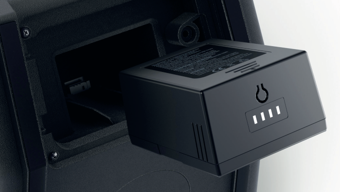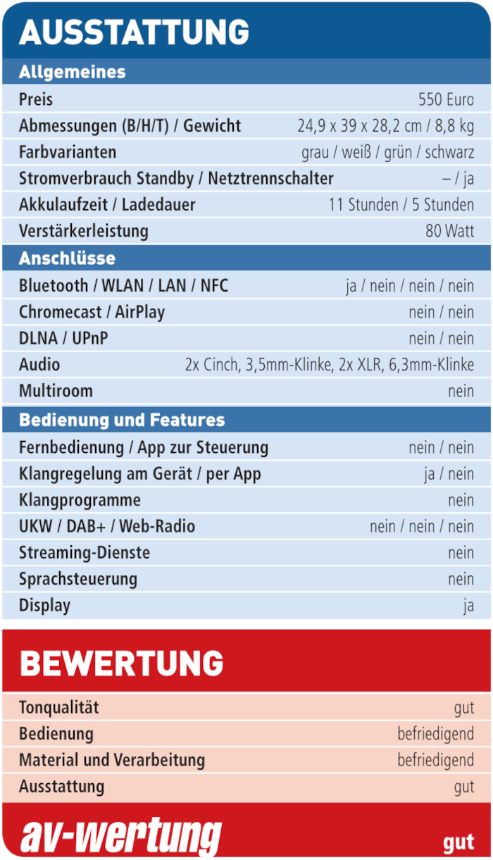 Abhilfe schafft die rückseitige Abschrägung, womit die Box diagonal nach oben gerichtet Räume besser beschallen kann. Die gummierten Füße sorgen dabei in der Horizontalen und in der Diagonalen für einen sicheren Stand. Zudem finden sich an der Unterseite Einbuchtungen für Stative. Eine davon versteckt sich unter einer Klappe, wo auch der 5000mAh-Akku verbaut ist. Dieser ist leicht auszutauschen und hält elf Stunden bei mittlerer Lautstärke. Komplett aufgeladen ist der Akku in fünf Stunden, nach drei schon zu 80 Prozent.