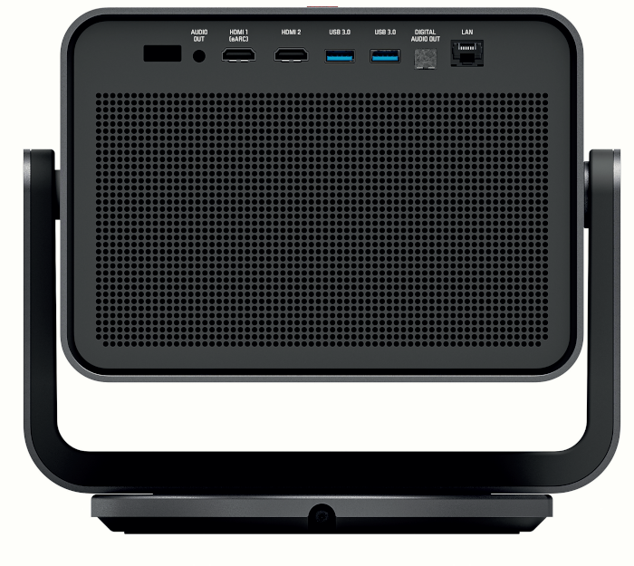 Mit einer Breite von 26 Zentimeter und einem Gewicht von 6,7 Kilogramm lässt sich der 3.500 Euro teure Cine Play 1 auch mobil einsetzen. Wer keinen Tisch in passender Höhe zur Verfügung hat, kann für 400 Euro einen Metallstandfuß erwerben, um den Beamer überall optimal zu platzieren. Darüber hinaus erweist er sich mit einem Strombedarf von 140 Watt als sehr genügsam.