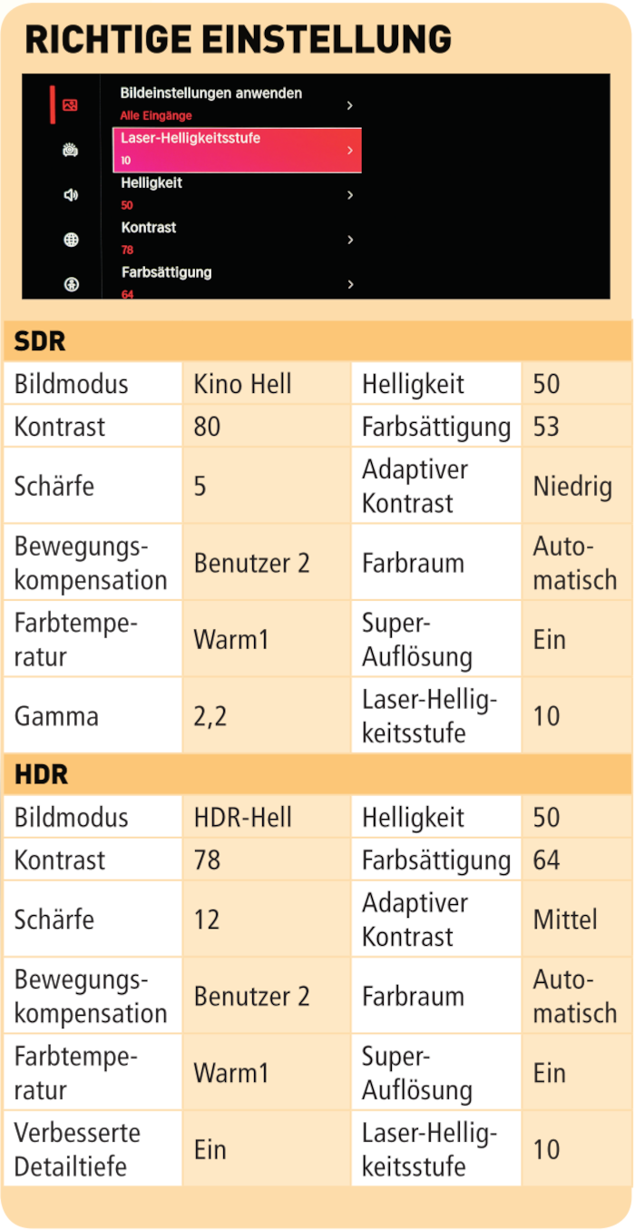 Die Navigation durch das etwas verschachtelte On-Screen-Menü erfolgt verzögerungsfrei. Für SDR- und die HDR-Formate liegen separate Bildmodi vor, die individuell angepasst werden können. Der Projektor erkennt das eingehende Signal und ordnet ihm den passenden Bildmodus zu.