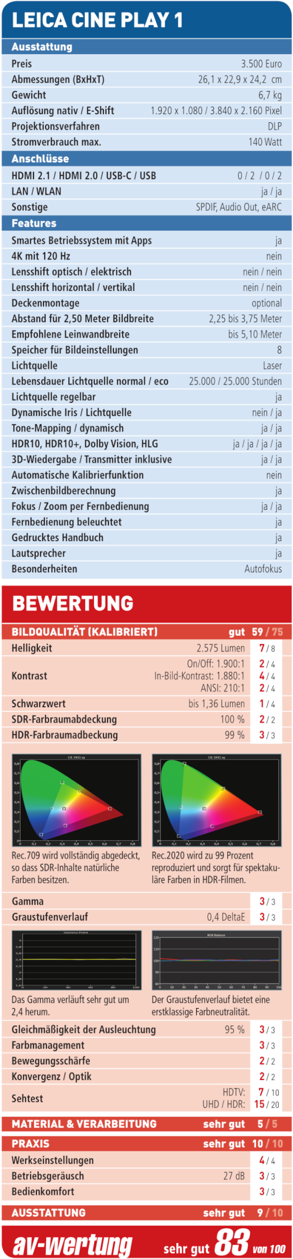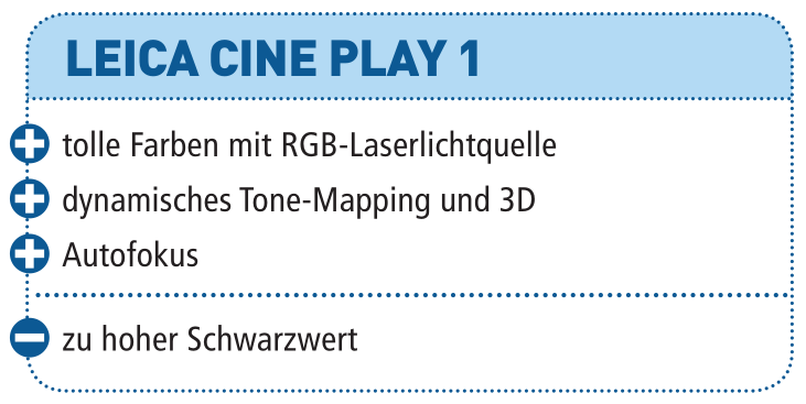 Der Leica Cine Play 1 punktet mit tollen Farben, hoher Schärfe, flexibler Aufstellung und vielen Streaming-Apps. Im Heimkino wäre aber ein dunkleres Schwarz erstrebenswert, zudem ist das Gerät mit 3.500 Euro nicht gerade günstig.