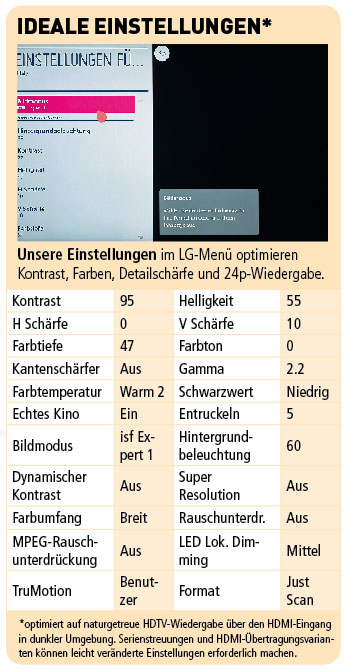 Allgemein zeichnen sich die isf-Modi durch eine angenehm warme (6.340 Kelvin) und neutrale Darstellung aus. Leider ist der Farbraum eingeschränkt, was zu einer etwas fahlen Bildwirkung führt. Unser Tipp: Stellt man den Farbumfang auf „Breit“ um, gewinnen vor allem blaue sowie grüne Nuancen an Sättigung, ohne dass die Delta-E-Abweichungen nennenswert schlechter werden. Infolgedessen erscheinen zum Beispiel die Bahamas-Szenen aus „Casino Royale“ deutlich brillanter. Der Kontrast liegt nur auf durchschnittlichem Niveau, in dunklen Bereichen verbessert die Local-Dimming-Schaltung auf Stufe „Mittel“ die Differenzierung.