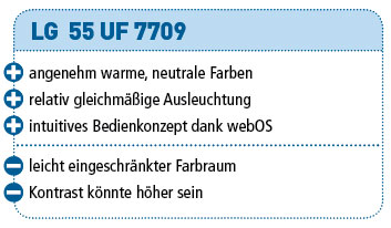 Der LG 55 UF 7709 gehört zu den unspektakulären UHD-TVs: Das hochgelobte webOS ist mittlerweile Standard, es stehen nur die wichtigsten Funktionen zur Verfügung und die Bildqualität liegt auf solidem Niveau. Die Südkoreaner machen damit zwar nichts falsch, aber auch keine Fortschritte.