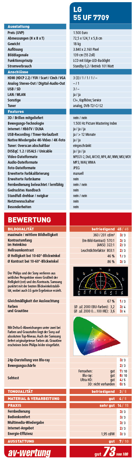 lg-pcOb der „Picture Mastering Index“ mit 1.600 statt 1.500 Hertz Bildrate, die 3D-Unterstützung sowie das Harman-Kardon-Soundsystem rund 600 Euro Aufpreis rechtfertigen, muss jeder selbst entscheiden. Das scheinen jedenfalls die einzigen Vorzüge des 2.100 Euro teuren 55 UF 8509 (audiovision 9-2015) gegenüber dem 1.500 Euro günstigen UF 7709. Folglich vermissen wir auch hier einen vierten HDMI-Port; vom Twin-Tuner ganz zu schweigen. Auf Local Dimming (Edge-LED) muss man erfreulicherweise nicht verzichten.