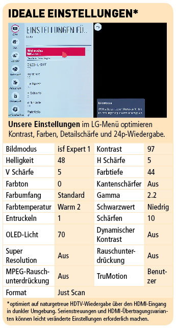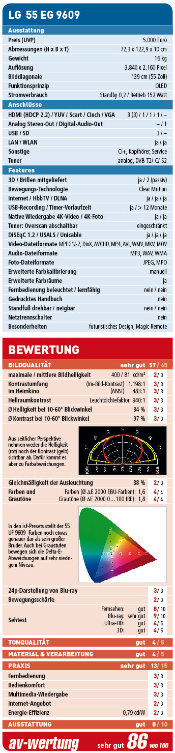 Auch wenn LGs OLED-Fernseher erst im Heimkino beziehungsweise bei Blu-ray-Zuspielung richtig aufblühen, geben sie sich vor TV-Enthusiasten keine Blöße. Übertreffen kann der 55 EG 9609 seinen großen Bruder mit maximal 324 Candela Lichtausbeute im farbneutralen Preset „isf Expert 1“ nicht wirklich, erzeugt dank des erstklassigen Hellraumkontrasts von 940:1 dennoch ein kräftiges Bild. Aus seitlicher Perspektive bleiben die Werte nahezu unverändert, allerdings treten – wie beim 65-Zöller – Farbverschiebungen auf: Bereits ab einem Betrachtungswinkel von 40 Grad driftet Weiß ins Blaue ab, während Hautnuancen gräulich und Gelbtöne limettengrün erscheinen. Hier sollten die Koreaner nachbessern.