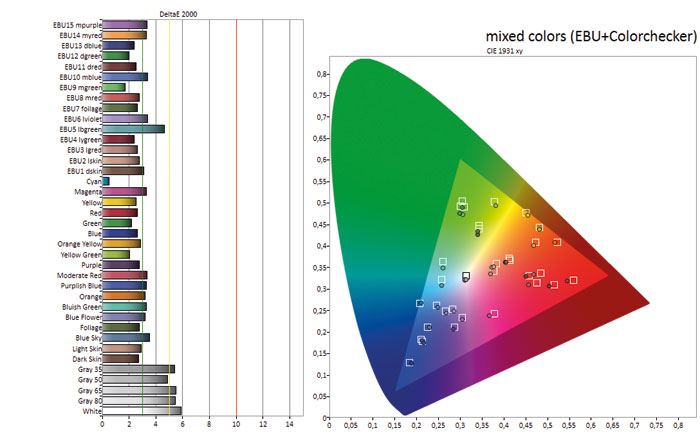 Keine Ausreißer: Der 65 UF 9509 reproduziert sowohl schwierige Farbnuancen wie Hauttöne sehr gut. Lediglich helle Graustufen tendieren leicht in Richtung Rosa.