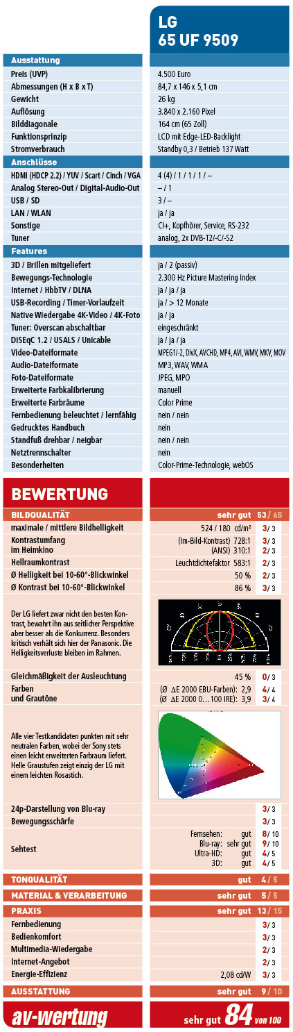 Der Testbericht LG 65 UF 9509 (Gesamtwertung: 84, Preis/UVP: 4500 Euro) ist in audiovision Ausgabe 10-2015 erschienen.