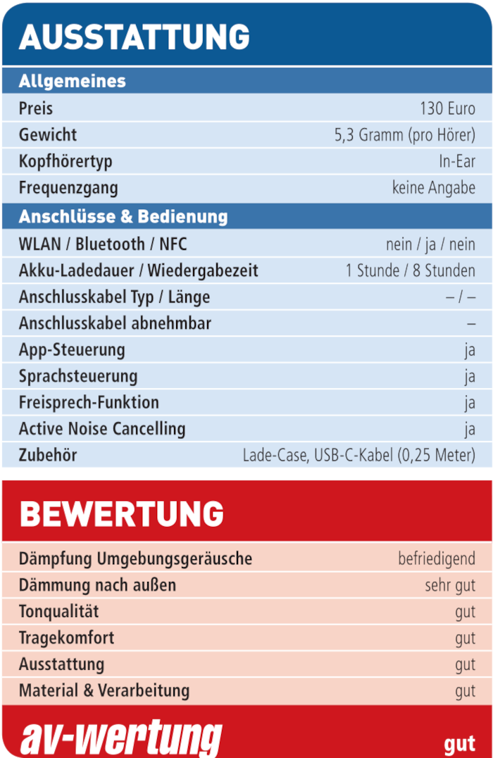 Im Lieferumfang enthalten sind drei Paar Silikonpassstücke (S, M, L), zwei Paar Silikonringe (M, L) für besseren Halt im Ohr sowie ein USB-C-Ladekabel. Das abgerundete Lade-Case ist dezent breiter als etwa von Apple oder Sony gewohnt, dafür mit 3,3 cm aber vergleichsweise flach. Die App ist für iOS und Android erhältlich und bietet Zugriff auf Funktionen wie „Multi-Point & Multi-Pairing“ (bis zu fünf Geräte möglich), die Art des Noise Cancellings (aus, an, Transparenz) und „Klangeffekt“, unter dem vier voreingestellte Equalizer-Kurven („Immersive“, „Natural“, „Bass Boost“, „Treble Boost“) sowie zwei „Custom“-Plätze für individuell angepasste Frequenzgänge via 8-Band-Regler zu finden sind. „Immersive“ steht dabei für einen „erweiterten Raumklang“, der allerdings dezent ausfällt und nicht an eine dedizierte Dolby-Atmos-Abmischung heranreicht. „Natural“ hingegen klingt ausgewogen und ist für alle Musikgenres gleichermaßen geeignet. Das Noise Cancelling bewegt sich im Mittelmaß: Mitbewerber wie Apple, Bose oder Sony können das besser; der Transparenz-Modus funktioniert hingegen okay.