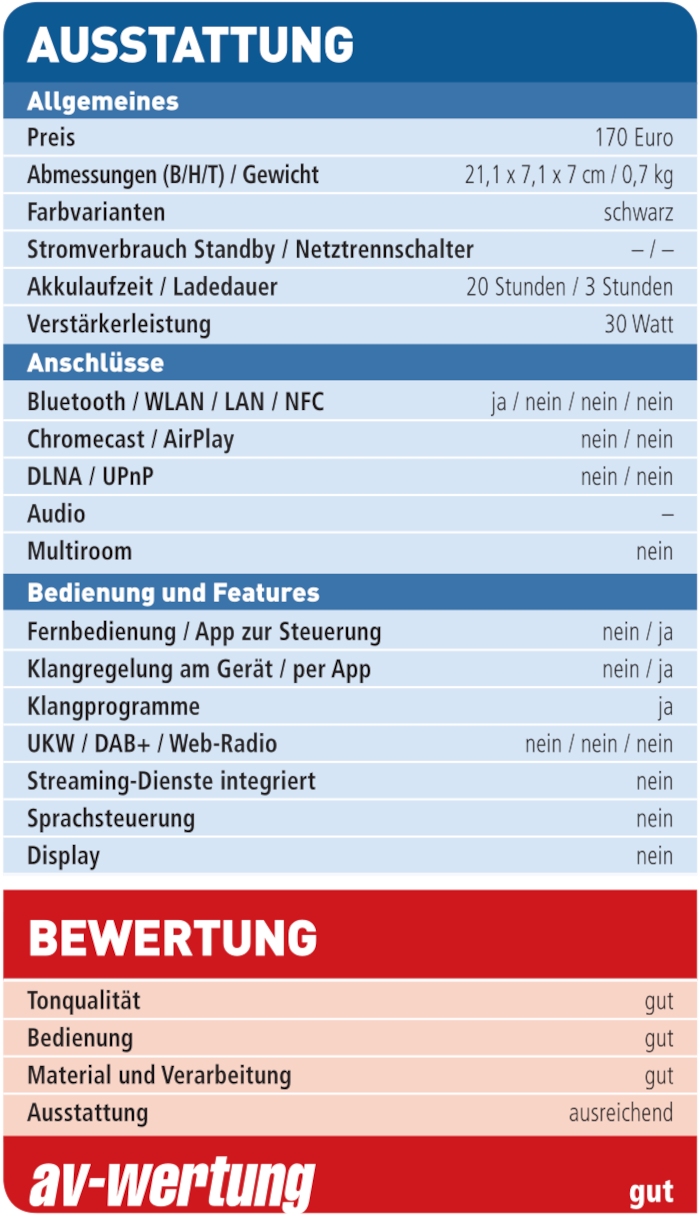 An der Oberseite befindet sich eine überschaubare Auswahl an Bedienelementen. Hier sind gut fühlbare Tasten zum Anschalten, Pausieren, Bluetooth, Favoriten, Lautstärke und Auracast verbaut. Mit letzterer lassen sich mehrere Speaker verbinden. Physische Audio-Anschlüsse sucht man hingegen vergeblich, lediglich ein USB-C-Anschluss zum Aufladen ist noch an Bord. Hierüber kann der Akku innerhalb von drei Stunden für eine mittlere Laufzeit von 20 Stunden fit gemacht werden.