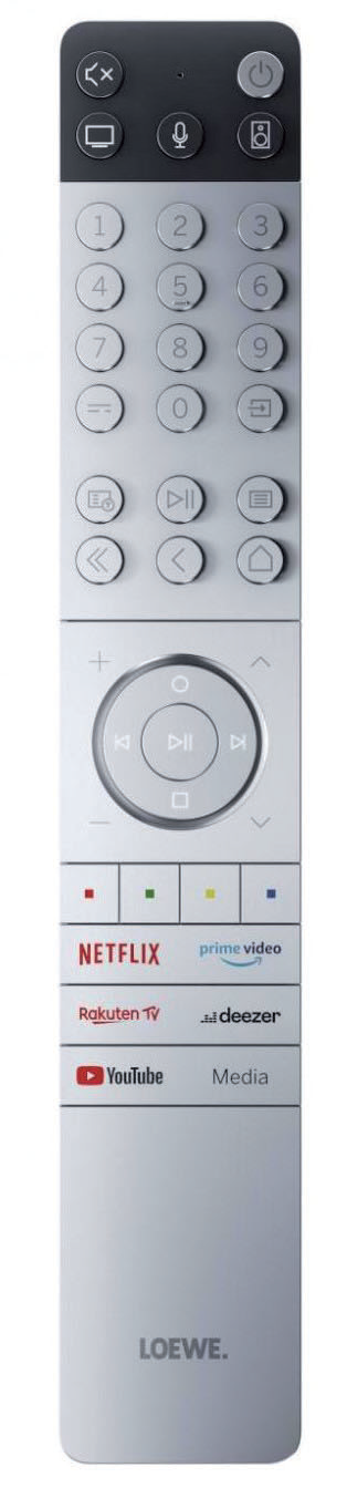 Das App-Angebot fällt speziell im Streaming-Bereich umfangreich aus, unter anderem sind Apple TV+, HD+, Amazon Prime Video, Disney+, Netflix, YouTube und Paramount+ abrufbar (mehr auf Seite 42). Per Fernbedienung hat man direkten Zugriff auf Netflix, Amazon Prime Video, Rakuten TV, Deezer, YouTube und Disney+. Der massive Steuerstab besteht aus Metall, ist schwer und macht einen äußerst hochwertigen Eindruck. Die teils beleuchteten Metalltasten sind übersichtlich angeordnet und bieten einen präzisen Druckpunkt. Zum Streamen von einem Tablet oder Smartphone unterstützt der Loewe Bluetooth, Miracast und AirPlay. Das TV-Gerät eignet sich als Mediaplayer und DLNA-Renderer.