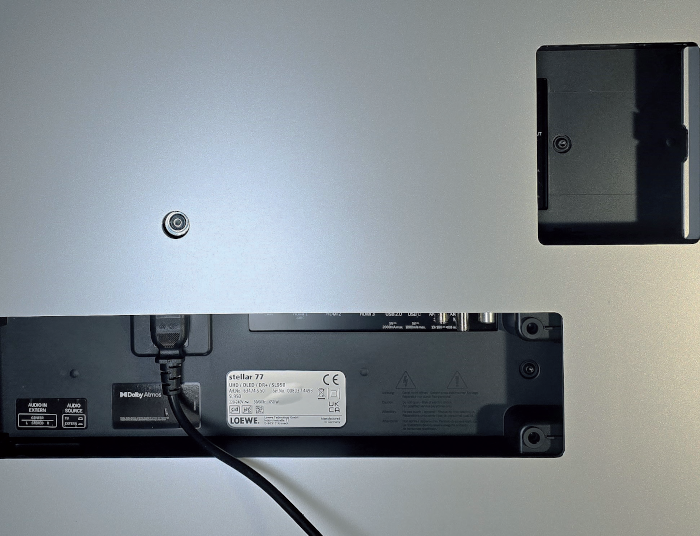 Der Loewe werkelt auf dem Chassis SL950 im Zusammenspiel mit einem Novatek NT72676 Chipsatz. Sein Arbeitstempo ist top. Gut zu wissen: Das Gerät verfügt über einen Netztrennschalter, was bei einem OLED eine Seltenheit ist, da man OLED-Fernseher aufgrund nächtlicher Panel-Refresh-Durchgänge eigentlich nicht vom Strom trennen sollte. Beim 77-Zöller befindet sich dieser in der Bildschirmmitte an der Geräteunterseite.