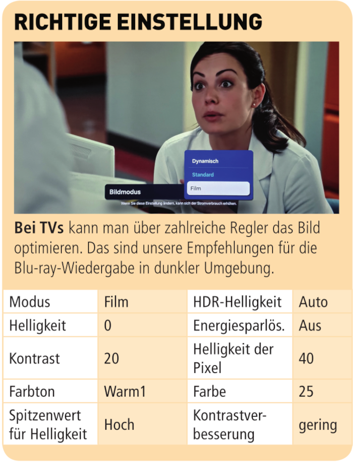 Aus HD-Material holt der Loewe dann auch ein ausgesprochen ansehnliches Bild raus – mit natürlichen Farben, guter Schärfe und schöner Plastizität. Hier kommen die positiven Eigenschaften eines OLEDs durch sattes Schwarz, hohen Kontrast und eine überzeugende Blickwinkelstabilität toll zur Geltung. Im „Film“-Modus dunkelt das Bild deutlich ab, zudem geht die Schärfe ein wenig verloren. Die Farben hinterlassen in diesem Setting dafür den natürlichsten Eindruck. Falls man sich etwas mehr Kontrast wünscht, kann man mit dem Feature „Kontrastverbesserung“ effektiv nachwürzen. Den Spitzenwert für die Helligkeit sollte man, wenn man das Maximum aus dem Panel herauskitzeln will, auf „Hoch“ stellen.