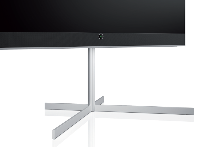 Das Gerät ist 7 Zentimeter tief und wird mit einer Wandhalterung geliefert, die bereits in der Geräterückwand integriert ist. Loewe bietet mit dem table stand motor stellar (großes Bild linke Seite) und dem floor stand motor stellar (kleines Bild im Kasten oben rechts) zwei zusätzliche jeweils um +/- 45 Grad motorisch drehbare Standlösungen mit versteckter Kabelführung an, die jeweils 1.200 Euro kosten. Manuell verstellbare Tischfüße gibt es nur bis 65 Zoll, alle Bodenstandfüße sind motorisch per Fernbedienung verstellbar. Die integrierte, nach vorne abstrahlende Soundbar versteckt sich hinter einem hochglanz-schwarz lackierten Metallgitter oder einem mattschwarzen Akustikstoff.