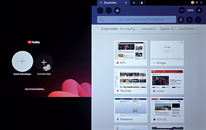 Parallele Welten: Links bei YouTube, rechts im Internet unterwegs. Auf dem 77-Zöller kann man zwei Quellen zeitgleich darstellen.